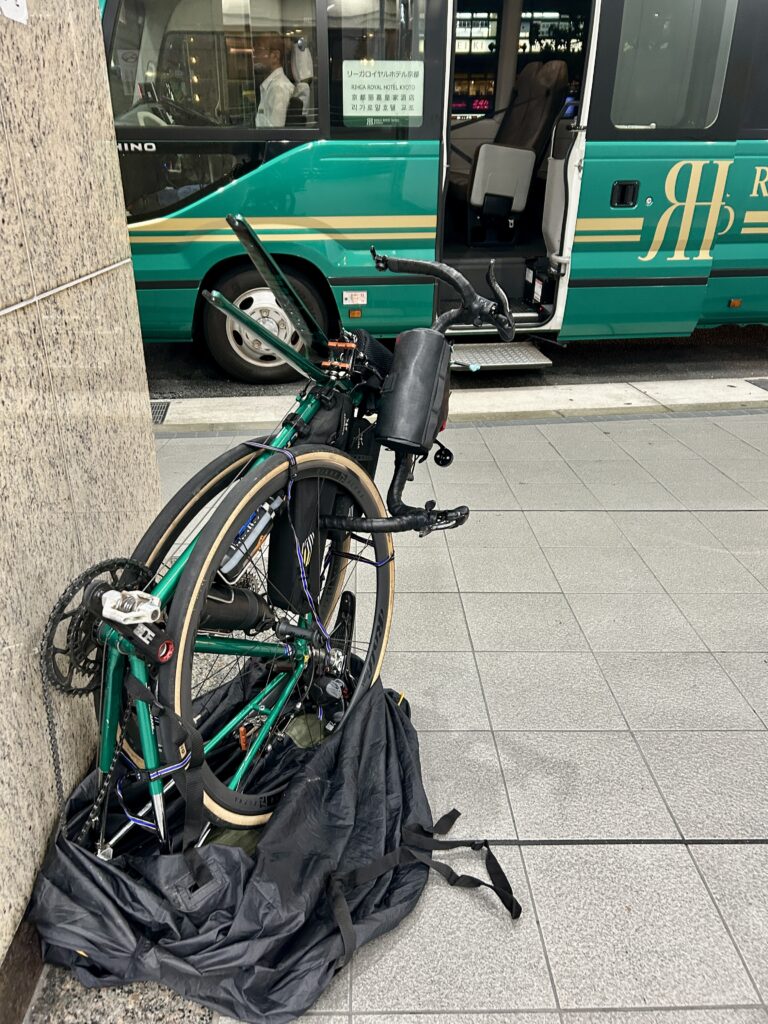 京都駅で輪行。リーガロ⚪︎ヤルの送迎バスの色、僕のバイクとお揃いね!