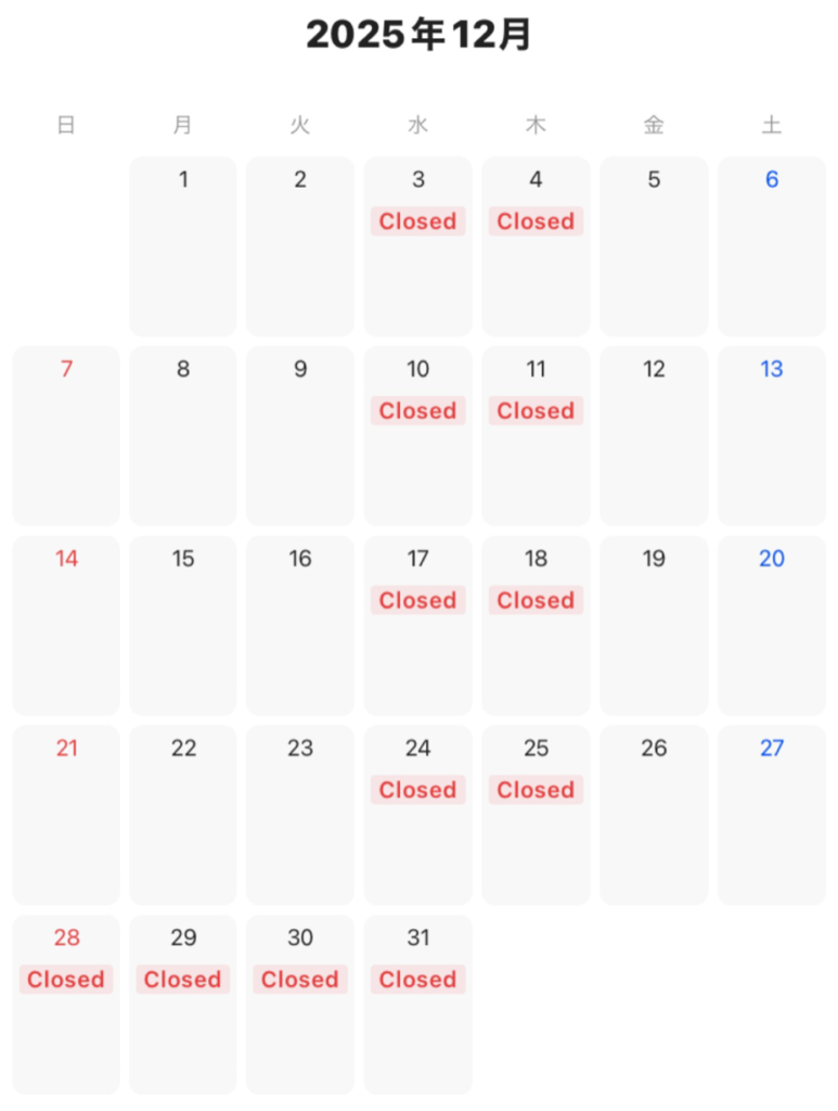 2025年11月5日 / 最終更新日時 : 2025年11月5日 whoo お知らせ 11月の休業日 11月の営業予定です。今月もバイクツアーのサポートの予定が入っており、臨時休業があります。ご理解のほどよろしくお願いいたします。